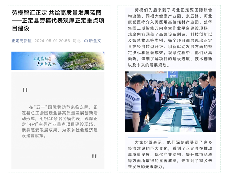 為了積極弘揚勞模精神,迎接“五一”國際勞動節的到來,正定縣總工會組織縣內40余名勞模代表,實地觀摩正定“4+1”主導產業重點項目建設現場,切身感受近年來正定縣的發展新變化??底u醫療介入類醫用高值耗材產業園作為受訪項目之一,進行了熱情接待和詳細的講解。新聞媒體正定高新區、正定發布(官方微信公眾號)對此次活動進行了相關報道。